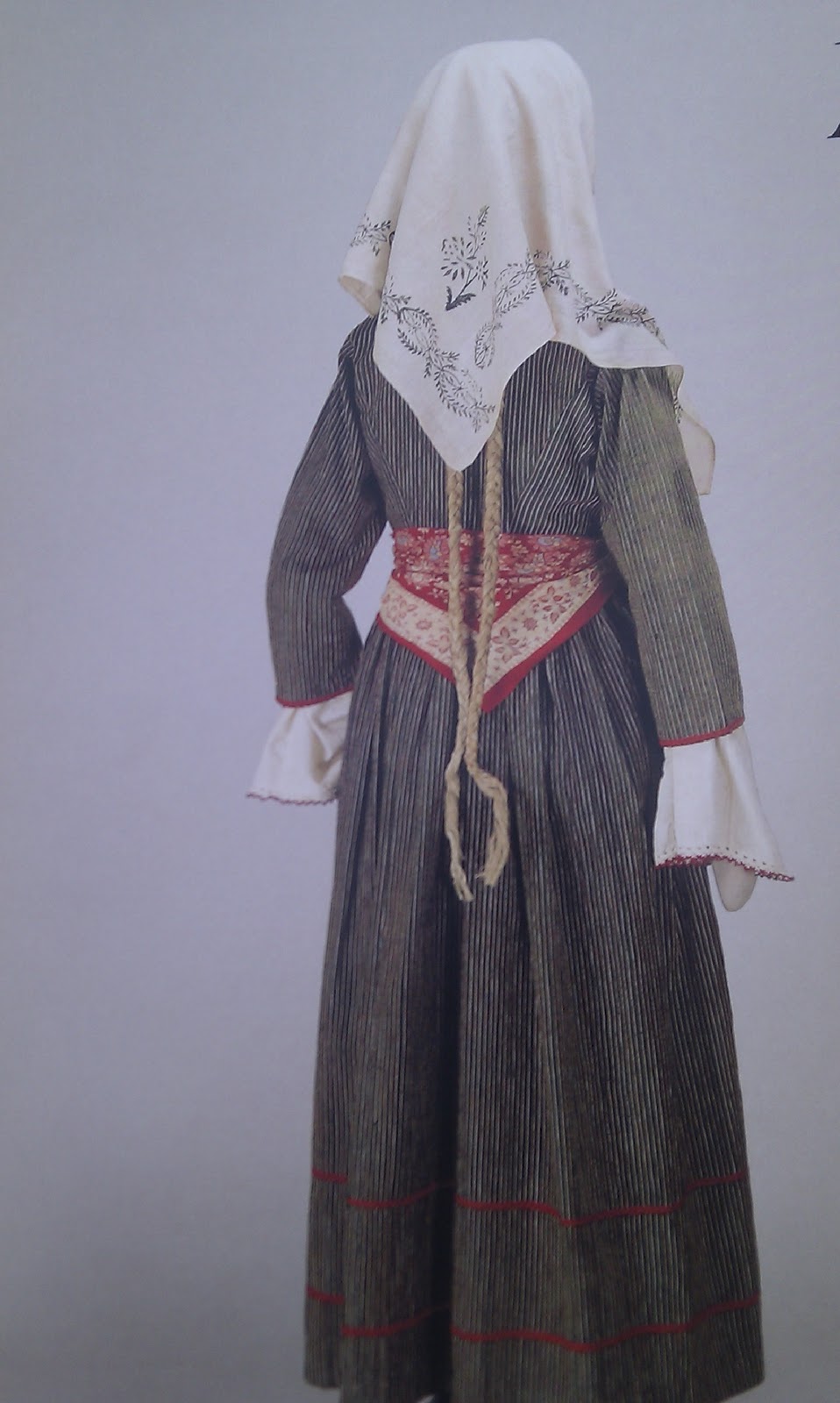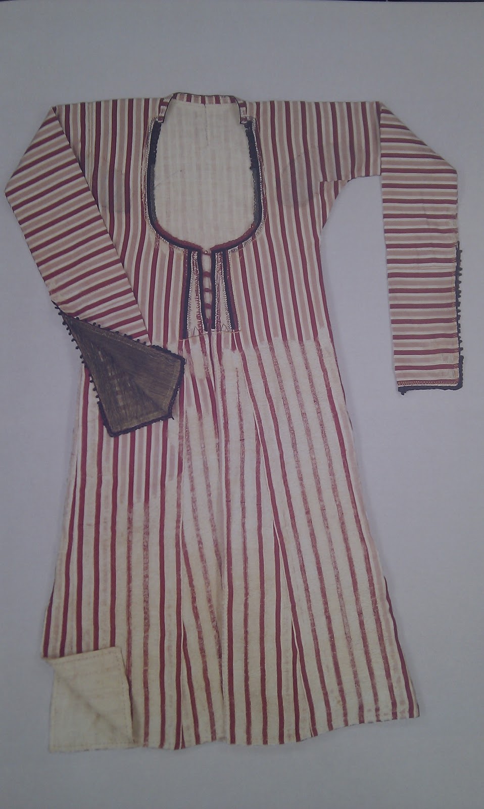 Η φάρμελη είναι φοδραρισμένη με άσπρο βαμβακερό ύφασμα, ενώ ο γιακάς και τα μανίκια έχουν φόδρα από βαμβακερό ριγωτό ύφασμα με σταμπωτές γιρλάντες και μπουκέτα λουλουδιών.